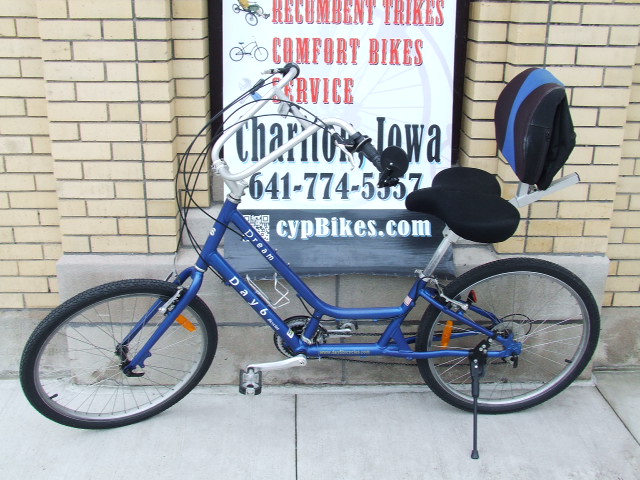 Good Day 6 Large Frame Dream 21-Speed in Blue.  Day 6 Bikes are marketed as the most comfortable upright bike made, and we would have to agree!  The pedal-forward position allows one's torso to be in an upright position, and the back rest and wide seat make for a very relaxing ride!  Included rear view mirror and kickstand.