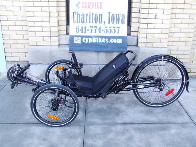 Excellent condition used Catrike Dumont in Black.  This is Catrike's version of full suspension along with a folding frame, making for a fast ride with both the comfort of a padded seat as well as the suspension.  Standard 30-speed bar-end shifting along with mechanical disc brakes.  As usual, it includes a rear view mirror, wrist rests, and a rear fender as standard equipment.