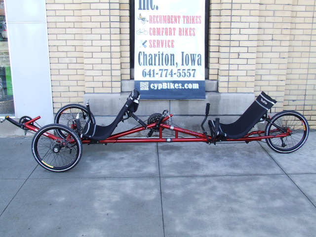 Excellent condition used TerraTrike Tandem Pro in Red.  27-speed Shimano Deore XT Shifting with Bar-ends.  Marathon Plus tires.  Standard S and S couplers allow it to take apart into 2 sections for transport.  Includes over-the-seat bag.