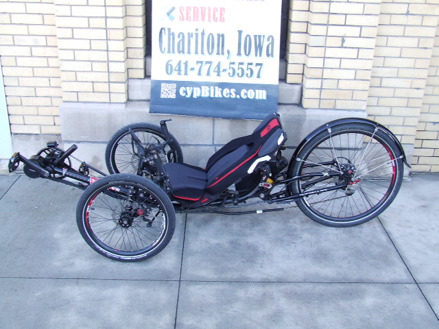Nice used ICE Sprint X with rigid frame in Black with Bafang Electric Assist.  The seat has been upgraded to the ICE Ergo-Luxe comfort padded.  This Sprint X has added options of a rear fender and front light.  Tires are Schwalbe Marathon Plus.  Gearing is 10-Speed Shimano derailleur with Bar-end shifting.