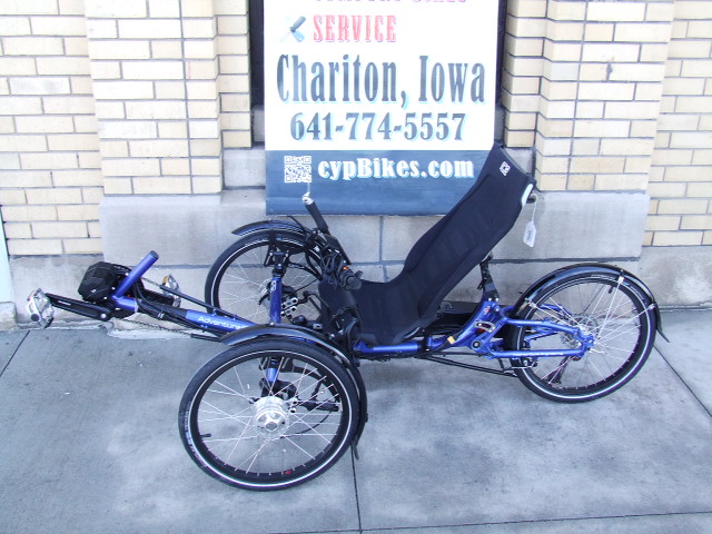 Nice used ICE Adventure fs20 in Blue.  This Adventure has shocks both front and rear for added comfort.  Gearing is a 9-speed shimano drive system with Bar-end shifter.  The electric assist is a CYC Photon Gen 1 motor which includes a throttle in addistion to the pedal assist.  The Trike has been well taken care of and is in great shape.  The upright position of the seat and higher entry/exit help those who may have difficulty in getting on and off a Trike.